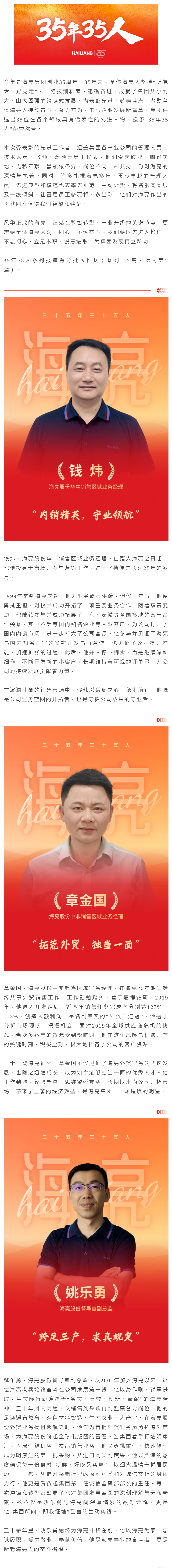 今年是海亮集團創業35周年。35年來,全體海亮人堅持“聽黨話、跟黨走”,一路披荊斬棘、砥礪奮進,成就了集團從小到大、由大圖強的跨越式發展。為表彰先進、鼓舞斗志,激勵全體海亮人接續奮斗、聚力有為,書寫企業發展新篇章,集團評選出35位在各個領域具有代表性的先進人物,授予“35年35人”榮譽稱號。