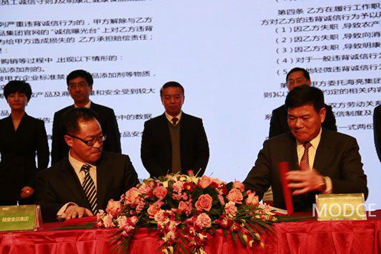 ▲海亮集團誠信大會現(xiàn)場 海亮集團董事局主席馮海良與旗下明康匯農(nóng)業(yè)品牌負責人簽署誠信協(xié)議 攝影 張超